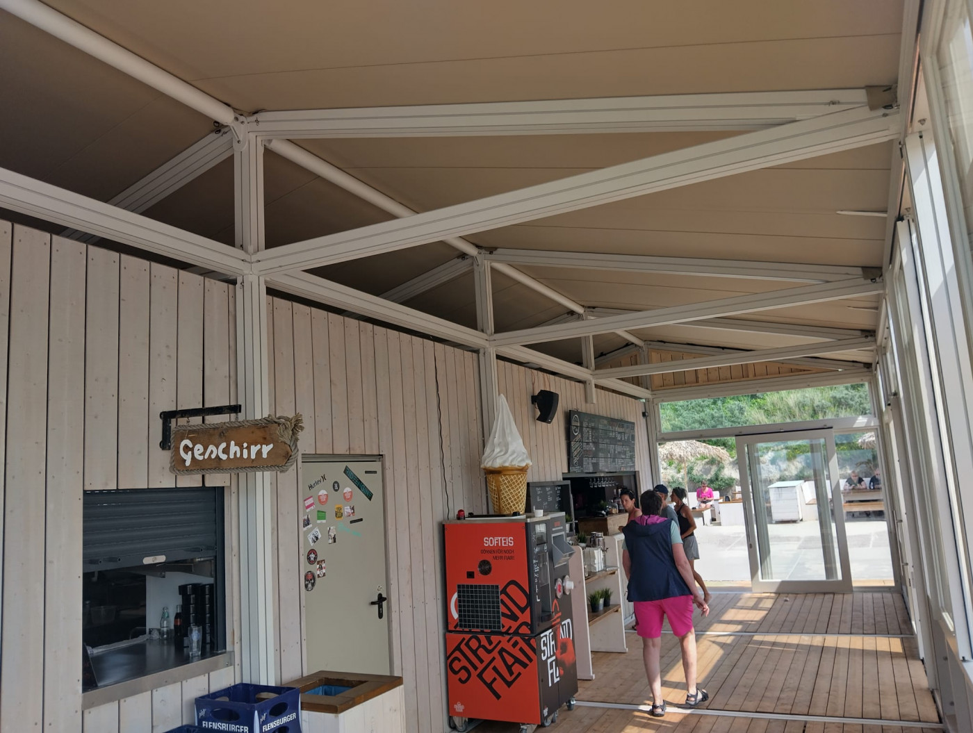 Diese leichtgewichtige Textilüberdachung besteht aus einer universellen modularen Tragkonstruktion aus Aluminium, die in jeder Größe geliefert und je nach Bedarf mit Boden, Dach, Sonnenschutz und Wänden ausgestattet wird.